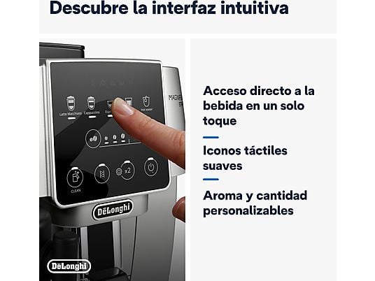 Sumérgete en el mundo del café, desde el grano hasta la taza. La cafetera superautomática Magnifica Start de De’Longhi, te ofrece todo lo que necesitas para preparar en casa tu bebida de café favorita a base de espresso. Cuenta con el exclusivo sistema de leche caliente LatteCrema para refinar tus bebidas con una fina espuma de leche y te permite elegir entre una selección de bebidas con solo tocar un botón.