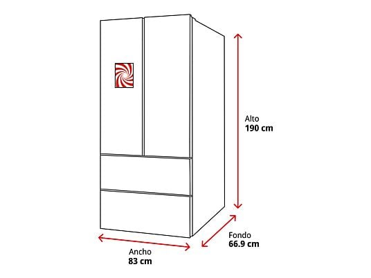 3 estantes regulables en altura, 2 Maxi-cajón verdulero, 6 compartimentos contrapuerta y cajón contrapuerta, 2 cajones en congelador, dispensador de hielo en bandeja |