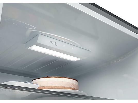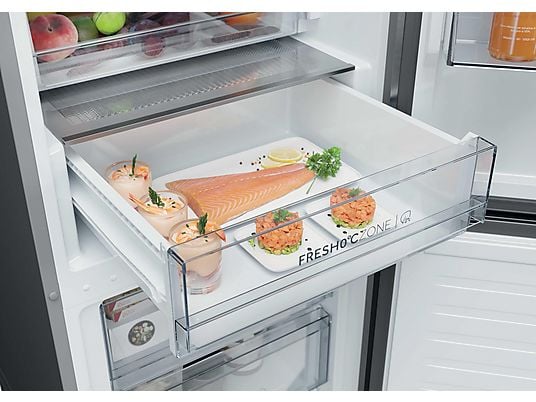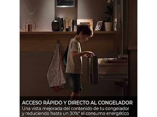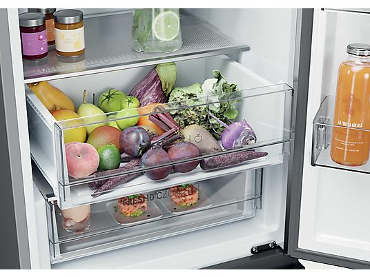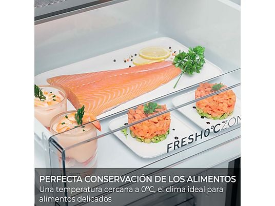 El sistema Total No Frost actúa automáticamente en ambos compartimentos evitando la formación de escarcha en paredes y cajones sin necesidad de descongelación manual, manteniendo además un entorno más limpio que ayuda a reducir la proliferación de moho y bacterias hasta un 94%. La tecnología Fresh 0°C Zone mantiene la temperatura del cajón específico justo por encima del punto de congelación, creando las condiciones ideales para conservar carnes frescas, pescados y embutidos durante más tiempo sin llegar a congelarlos, preservando su frescura y calidad natural con mayor efectividad que un cajón convencional estándar.