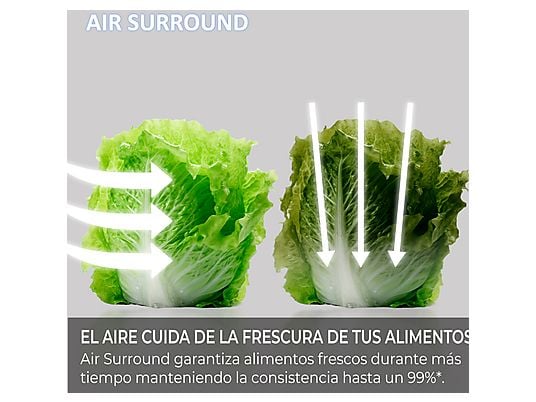 La tecnología exclusiva Haier Air Surround Fresher Tech distribuye el aire frío de forma homogénea y envolvente mediante salidas laterales especiales que abrazan los alimentos en toda la cavidad sin flujo directo sobre ellos, a diferencia de los sistemas de ventilación frontal convencionales que resecan y deshidratan los alimentos con el paso del tiempo.