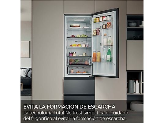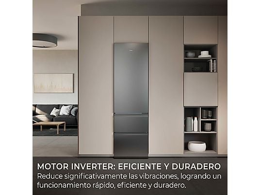 Los 414 litros de capacidad total distribuidos en 289 litros de frigorífico y 125 litros de congelador se organizan con total flexibilidad gracias a los 3 estantes ajustables de cristal con perfil silver, las 5 balconeras, los 2 cajones verduleros y la cubitera transparente incluida. La iluminación LED interior ilumina de forma clara y uniforme cada rincón del frigorífico facilitando la localización de cualquier alimento de un vistazo. Con solo 35 dB y clase de ruido acústico B, los tiradores integrados Confort, la puerta reversible y la app hOn Smart Contents con consejos de conservación, este frigorífico de 59,5 x 66,7 x 205 cm combina eficiencia, organización y diseño con una autonomía de 13 horas ante cualquier fallo eléctrico.
