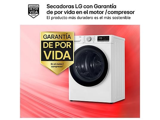 * La garantía de por vida del motor y el compresor de la secadora ofrece una cobertura de 30 años en la pieza: 3 años de garantía legal y 27 años de garantía comercial. Se informa de que el periodo de 30 años excede la vida media útil de las secadoras, calculada en 12 años según un estudio realizado por un organismo independiente en el que LGEES no ha participado. Esta garantía únicamente cubre el coste de la pieza, siendo los costes adicionales responsabilidad del cliente. Los términos de esta garantía comercial sobre el motor/compresor (salvo el plazo) son los mismos que los del apartado 5 de la tarjeta de garantía de electrodomésticos en https://www.lg.com/es/soporte/condiciones-de-garantia/. Promoción válida por tiempo limitado. Consulte fechas y condiciones en las bases legales recogidas en www.tuserviciolg.com/promociones/garantiadeporvida.